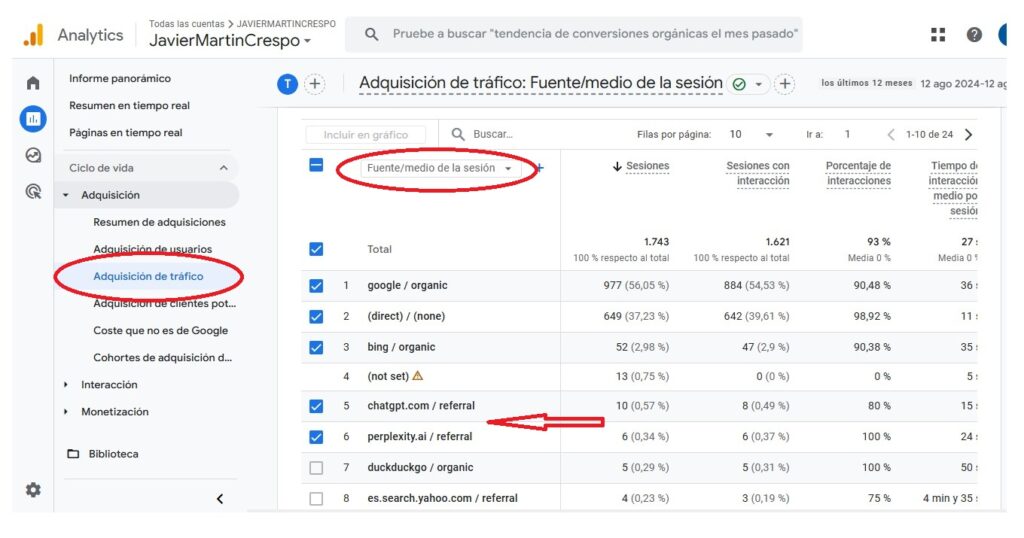 En Google Analytics 4: Ve a Informe de adquisición > Tráfico por canal y filtra tráfico por Fuente/medio